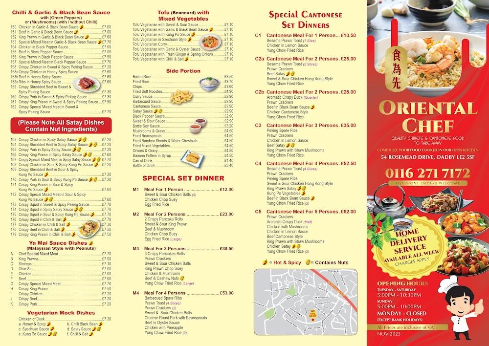 The Oriental Chef stands proudly at the bustling Rosemead Drive in Oadby, Leicester. This friendly neighborhood eatery serves up authentic Chinese flavors and offers a welcoming atmosphere perfect for families and food lovers alike. With a wheelchair-accessible entrance, everyone can enjoy the delicious offerings. It operates daily, ensuring you can satisfy your Chinese cuisine cravings whenever they hit. The free parking nearby adds to the convenience, making it straightforward to pop in whether you're in a rush or planning a cozy dinner with friends. The attentive staff, known for their friendly demeanor, enhance the overall experience, providing a level of service that often exceeds customer's expectations. Located within a short distance from local shops, Oriental Chef serves as a local gem, popular for its late-night food and generous portions. Enjoy taking a seat or opting for a quick takeaway—the choice is yours!